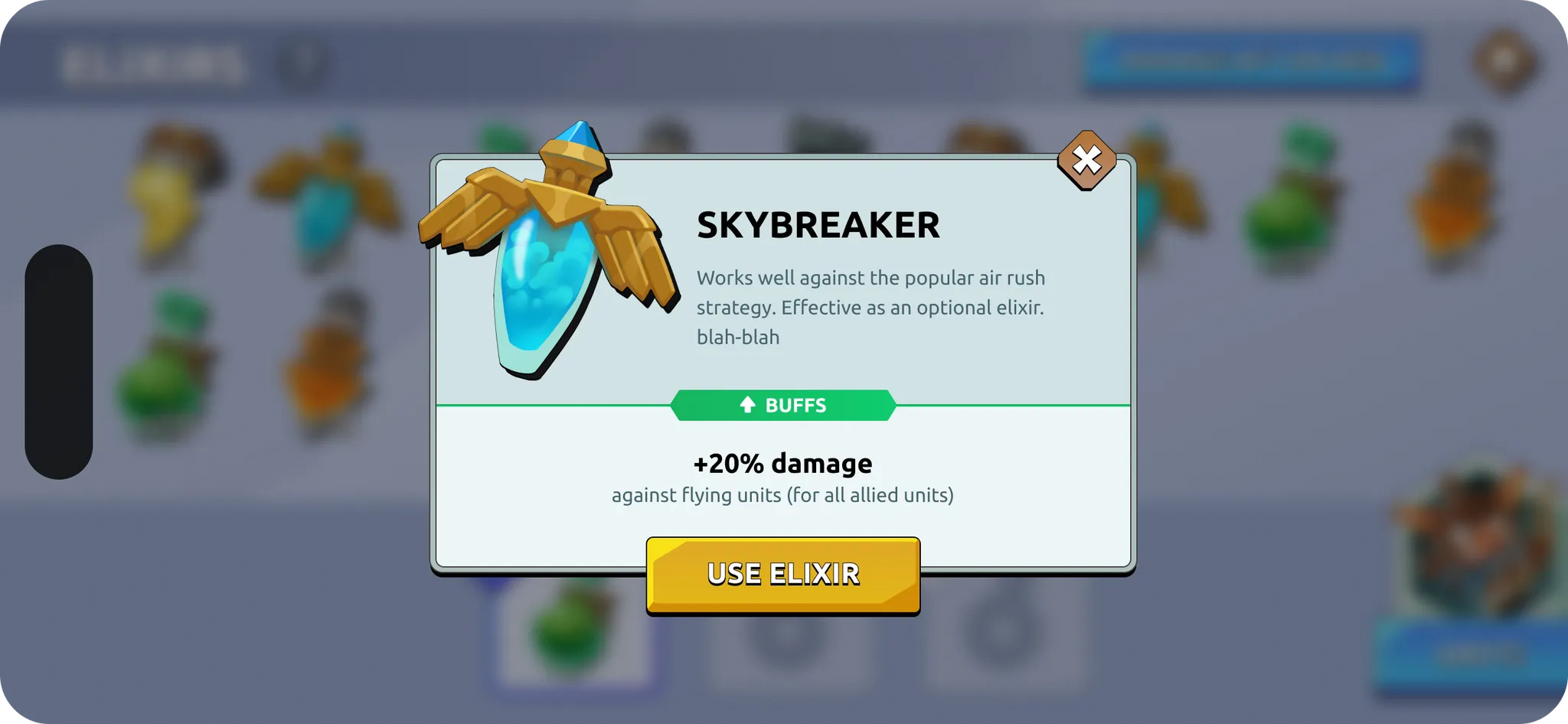 - Elixirs are consumable power-ups that players can activate before battles.