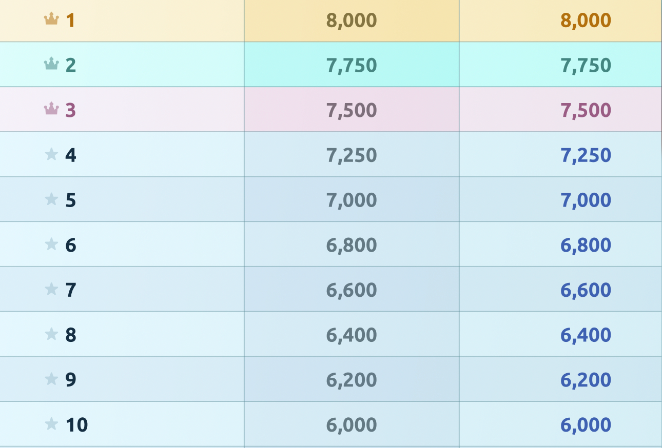 - Ranks 11–20: from 5,000 down to 2,000 tokens