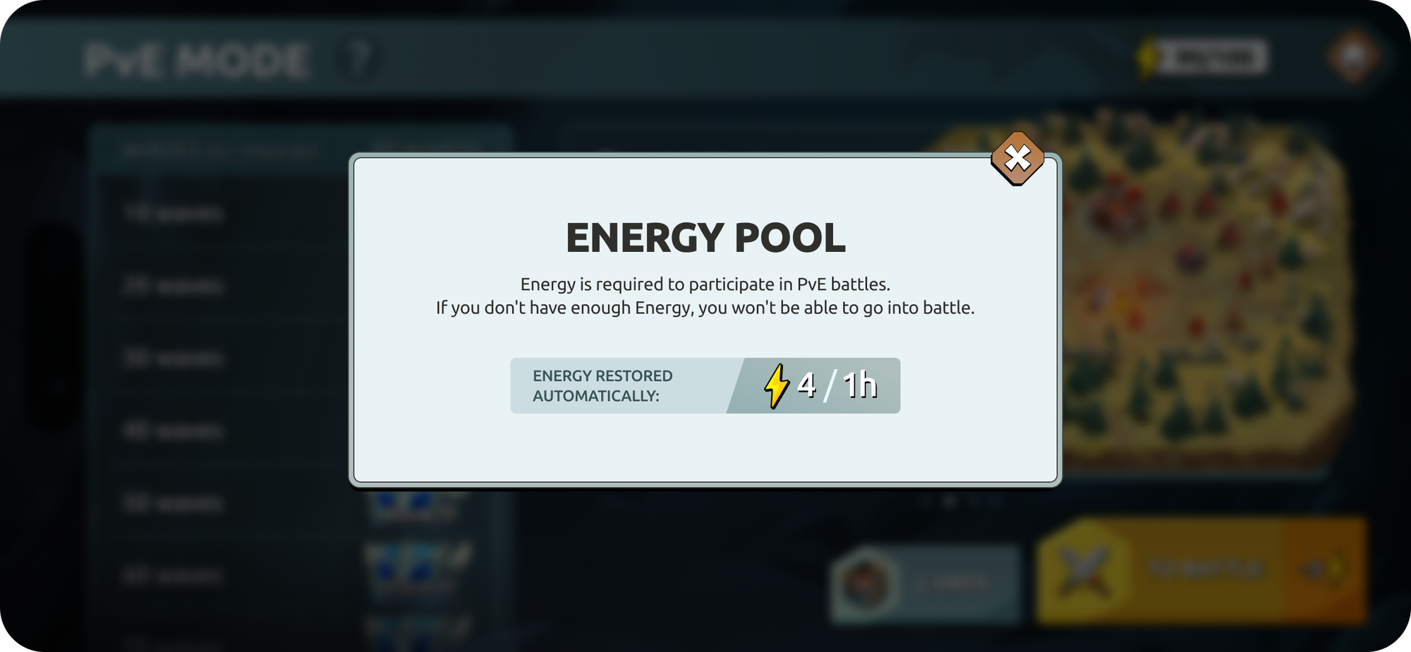 Each battle costs 25 energy, with a total of 100 energy per day (regenerating 1 point every 15 minutes).