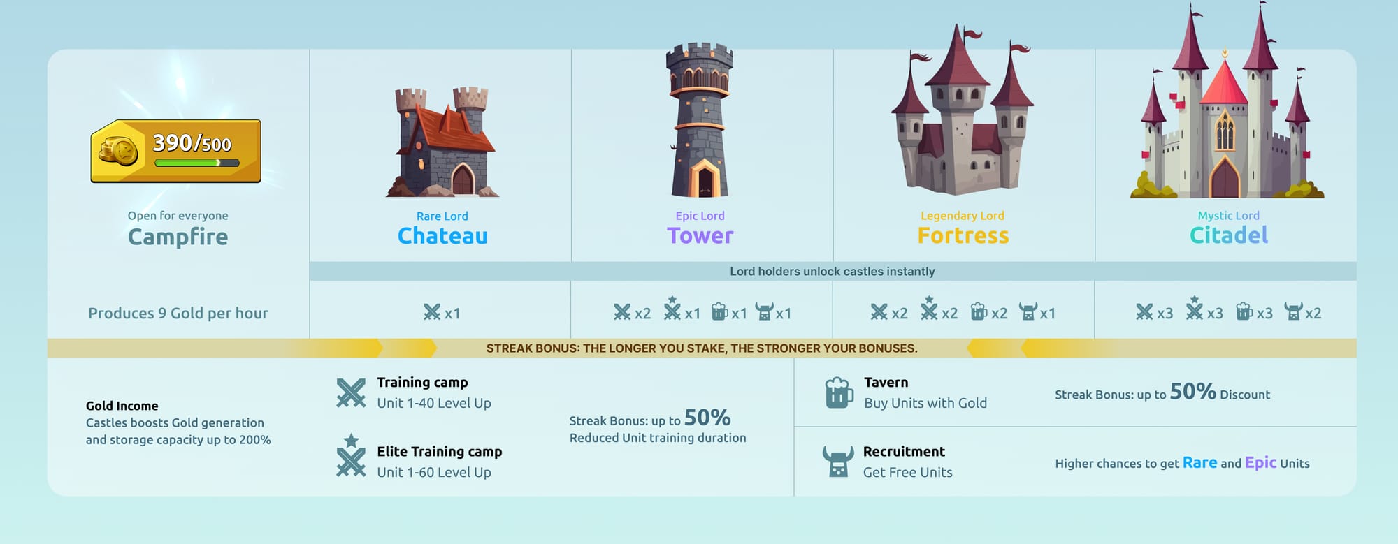 - ⛺🔥 Campfire: The core of the Castle, periodically generating Gold. Lords don't give additional Campfires, but higher types of Castles boost the overall Gold production speed & Storage capacity. Both gradually increase, up to 200% by the 9th month of staking. See 👉 Lord Streak Bonuses.