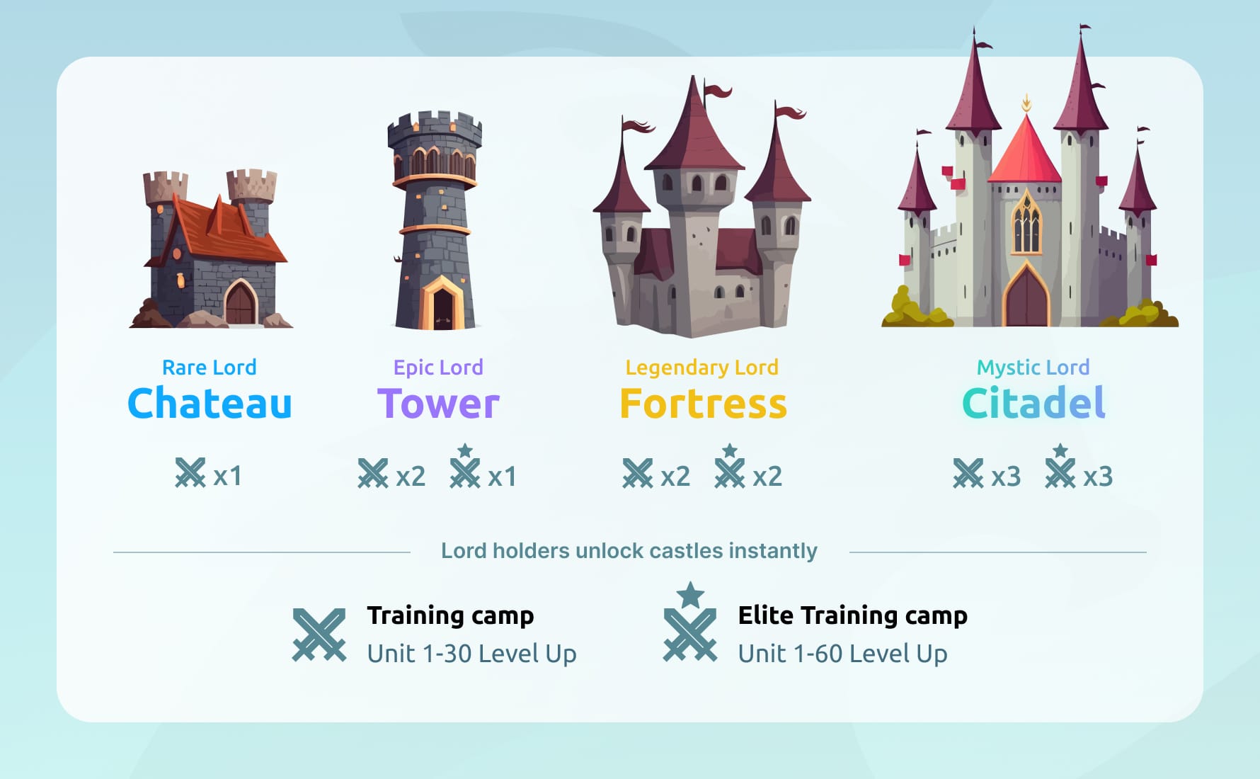 - Camps for multiple Lords stakers: The number of Training Camps available is based on the quantity and quality of Castles, which depends on the number of staked Lords.